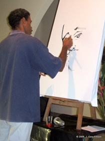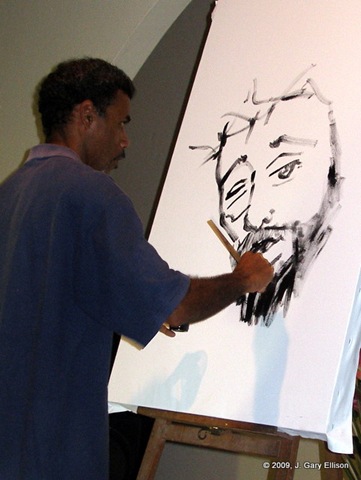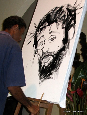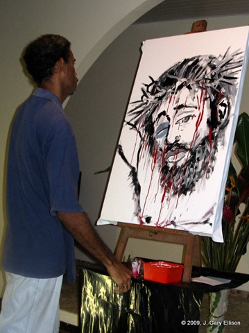 Samedi soir, Pasteur Joseph John qui est un artiste local bien connu, après avoir fait une méditation sur l’œuvre de Christ, a fait en dix minutes un tableau de “Christ pour nous” sur la croix. Il s’est servi de quatre couleurs en peinture acrylique : noir, blanc, bleu et rouge.
